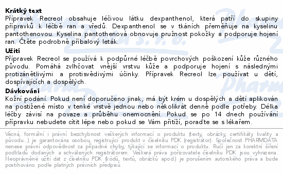 Přípravek Recreol obsahuje léčivou látku dexpanthenol, která patří do skupiny přípravků k léčbě ran a vředů. Dexpanthenol se v tkáních přeměňuje na kyselinu pantothenovou. Kyselina pantothenová obnovuje pružnost pokožky a podporuje hojení ran. Čtěte pozorně příbalový leták.