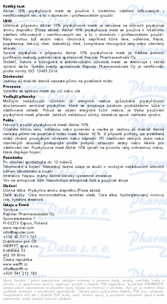 Abilar 10% pryskyřicová mast se používá k lokálnímu ošetření infikovaných i neinfikovaných ran, a to v domácím i profesionálním použití.