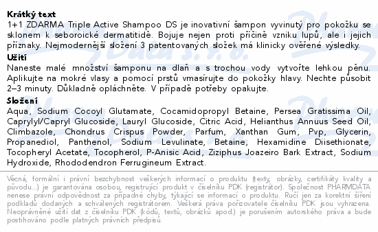 1+1 ZDARMA Triple Active Shampoo DS je inovativní šampon vyvinutý pro pokožku se sklonem k seboroické dermatitidě. Bojuje nejen proti příčině vzniku lupů, ale i jejich příznaky. Nejmodernější složení 3 patentovaných složek má klinicky ověřené výsledky.