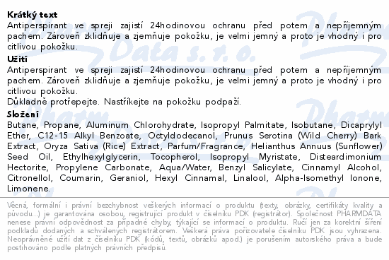 Antiperspirant ve spreji zajistí 24hodinovou ochranu před potem a nepříjemným pachem. Zároveň zklidňuje a zjemňuje pokožku, je velmi jemný a proto je vhodný i pro citlivou pokožku.