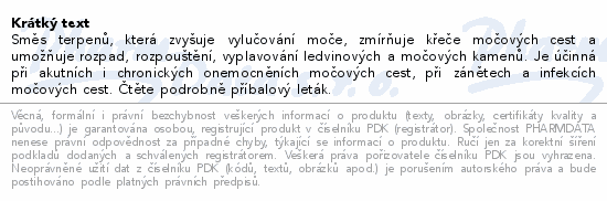Směs terpenů, která zvyšuje vylučování moče, zmírňuje křeče močových cest a umožňuje rozpad, rozpouštění, vyplavování ledvinových a močových kamenů. Je účinná při akutních i chronických onemocněních močových cest, při zánětech a infekcích močových cest. Čtěte pozorně příbalový leták.