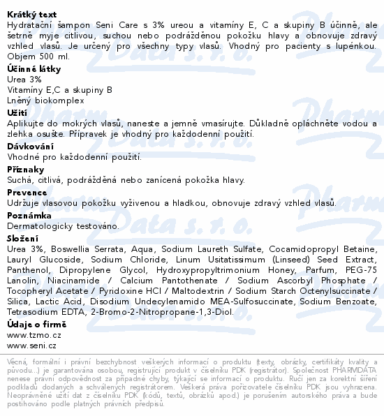 Hydratační šampon Seni Care s 3% ureou a vitamíny E, C a skupiny B účinně, ale šetrně myje citlivou, suchou nebo podrážděnou pokožku hlavy a obnovuje zdravý vzhled vlasů. Je určený pro všechny typy vlasů. Vhodný pro pacienty s lupénkou. Objem 500 ml.