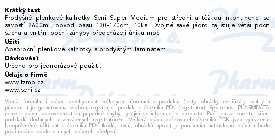 Prodyšné plenkové kalhotky Seni Super Medium pro střední a těžkou inkontinenci se savostí 2600ml, obvod pasu 130-170cm, 10ks. Dvojité savé jádro zajišťuje větší pocit sucha a vnitřní boční záhyby předcházejí úniku moči.