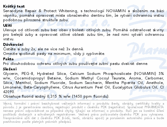 Sensodyne Repair & Protect Whitening, s technologií NOVAMIN a složením na bázi vápníku, pomáhá opravovat místa obnaženého dentinu tím, že vytváří ochrannou vrstvu podobnou přirozené struktuře zubu.