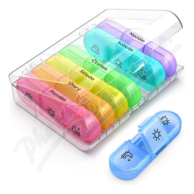 Cestovní dávkovač léků se zásuvnými boxy pro každý den v týdnu, přehledně...