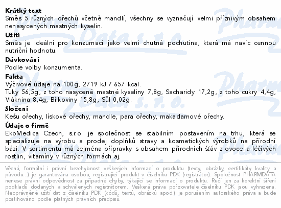 Směs 5 různých ořechů včetně mandlí, všechny se vyznačují velmi příznivým obsahem nenasycených mastných kyselin.