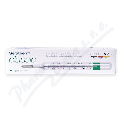 Teploměr skleněný bezrtuťový Geratherm měří teplotu těla přesně a spolehlivě. Má 10letou záruku přesnosti (0, 10-0, 15°C). Je 100% hygienický. Přiložené sklepávadlo umožní lepší sklepávání galia. Originál - vyráběný v Německu.