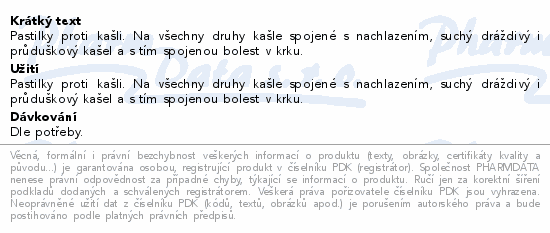 Pastilky proti kašli. Na všechny druhy kašle spojené s nachlazením, suchý dráždivý i průduškový kašel a s tím spojenou bolest v krku.