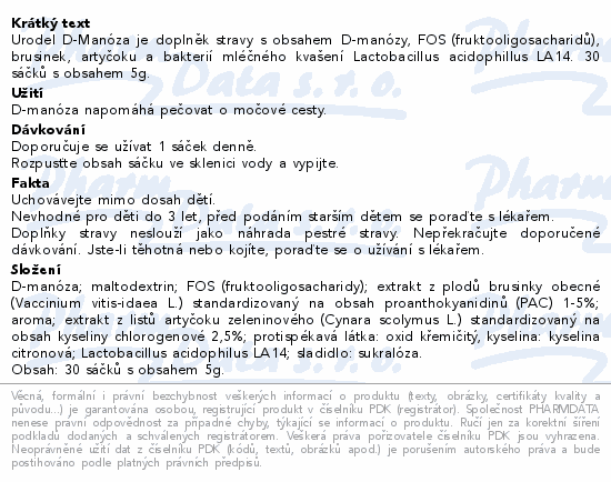 Urodel D-Manóza je doplněk stravy s obsahem D-manózy, FOS (fruktooligosacharidů), brusinek, artyčoku a bakterií mléčného kvašení Lactobacillus acidophillus LA14. 30 sáčků s obsahem 5g.