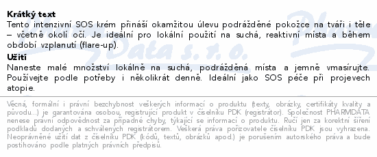 Tento intenzivní SOS krém přináší okamžitou úlevu podrážděné pokožce na tváři i těle – včetně okolí očí. Je ideální pro lokální použití na suchá, reaktivní místa a během období vzplanutí (flare-up).