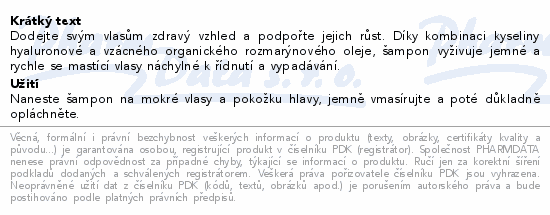 Dodejte svým vlasům zdravý vzhled a podpořte jejich růst. Díky kombinaci kyseliny hyaluronové a vzácného organického rozmarýnového oleje, šampon vyživuje jemné a rychle se mastící vlasy náchylné k řídnutí a vypadávání.