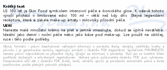 Už 100 let je Skin Food symbolem intenzivní péče a ikonického glow. K oslavě tohoto výročí přichází v limitované edici 100 ml – větší než kdy dřív. Stejná legendární receptura, která si získala make-up artisty i milovníky přírodní péče.