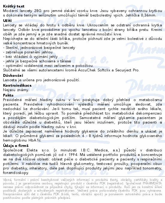 Moderní lancety 28G pro jemné získání vzorku krve. Jsou vybaveny ochrannou krytkou s dokonale tenkým seříznutím umožňující téměř bezbolestný vpich. Jehlička 0, 36mm.