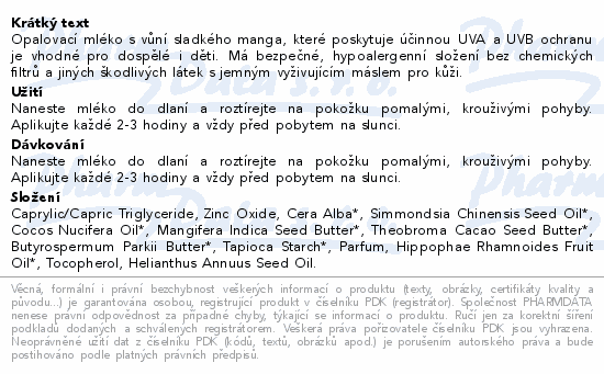 Opalovací mléko s vůní sladkého manga, které poskytuje účinnou UVA a UVB ochranu je vhodné pro dospělé i děti. Má bezpečné, hypoalergenní složení bez chemických filtrů a jiných škodlivých látek s jemným vyživujícím máslem pro kůži.