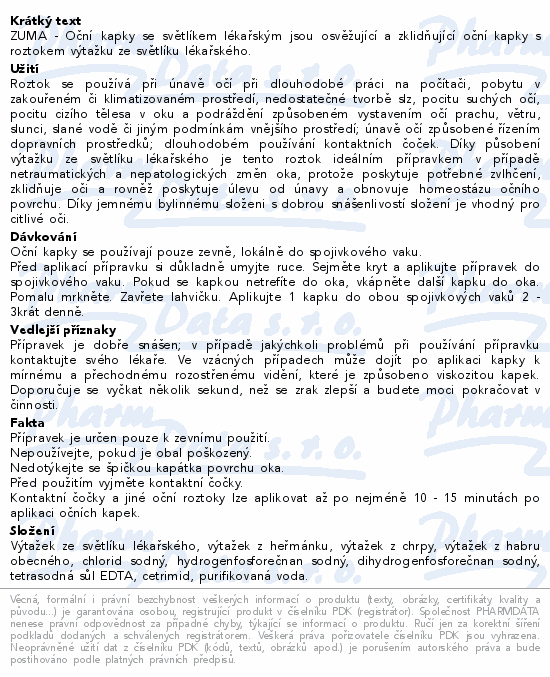 ZUMA - Oční kapky se světlíkem lékařským jsou osvěžující a zklidňující oční kapky s roztokem výtažku ze světlíku lékařského.